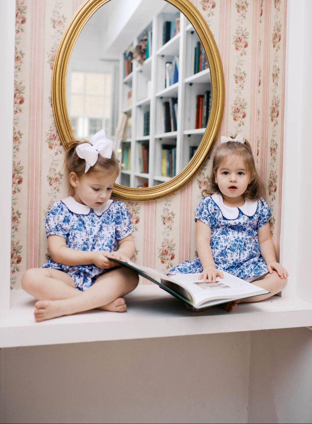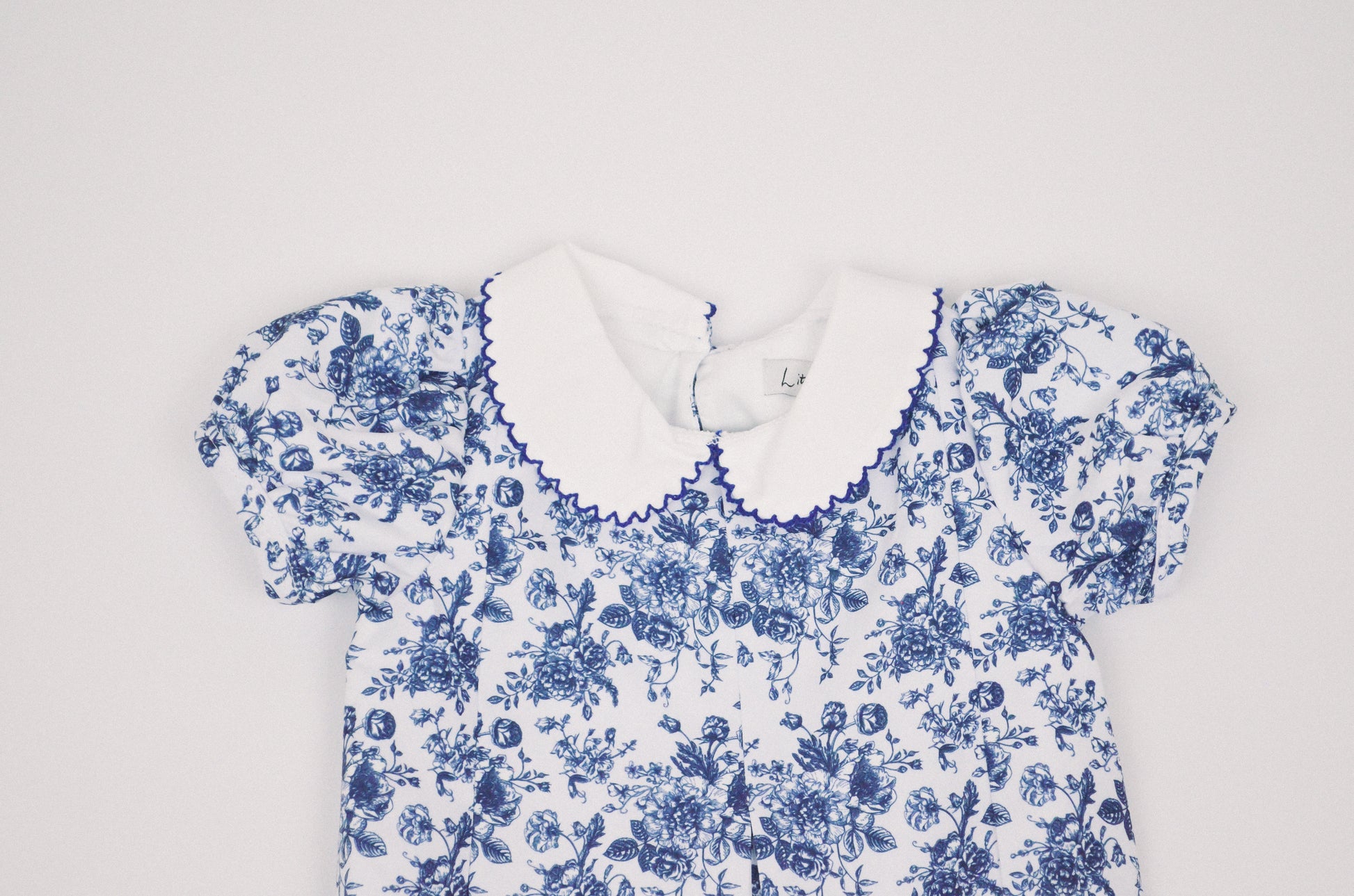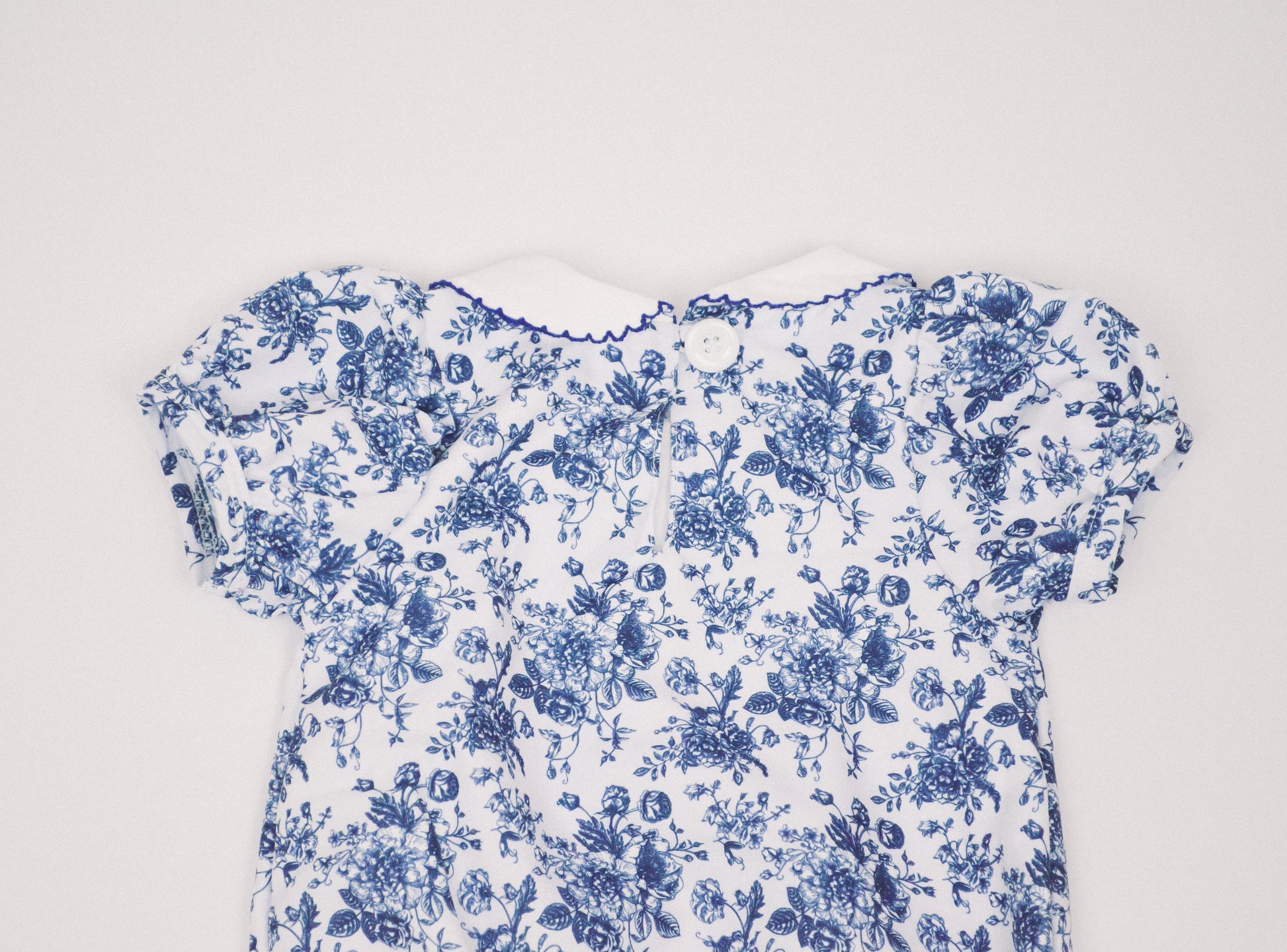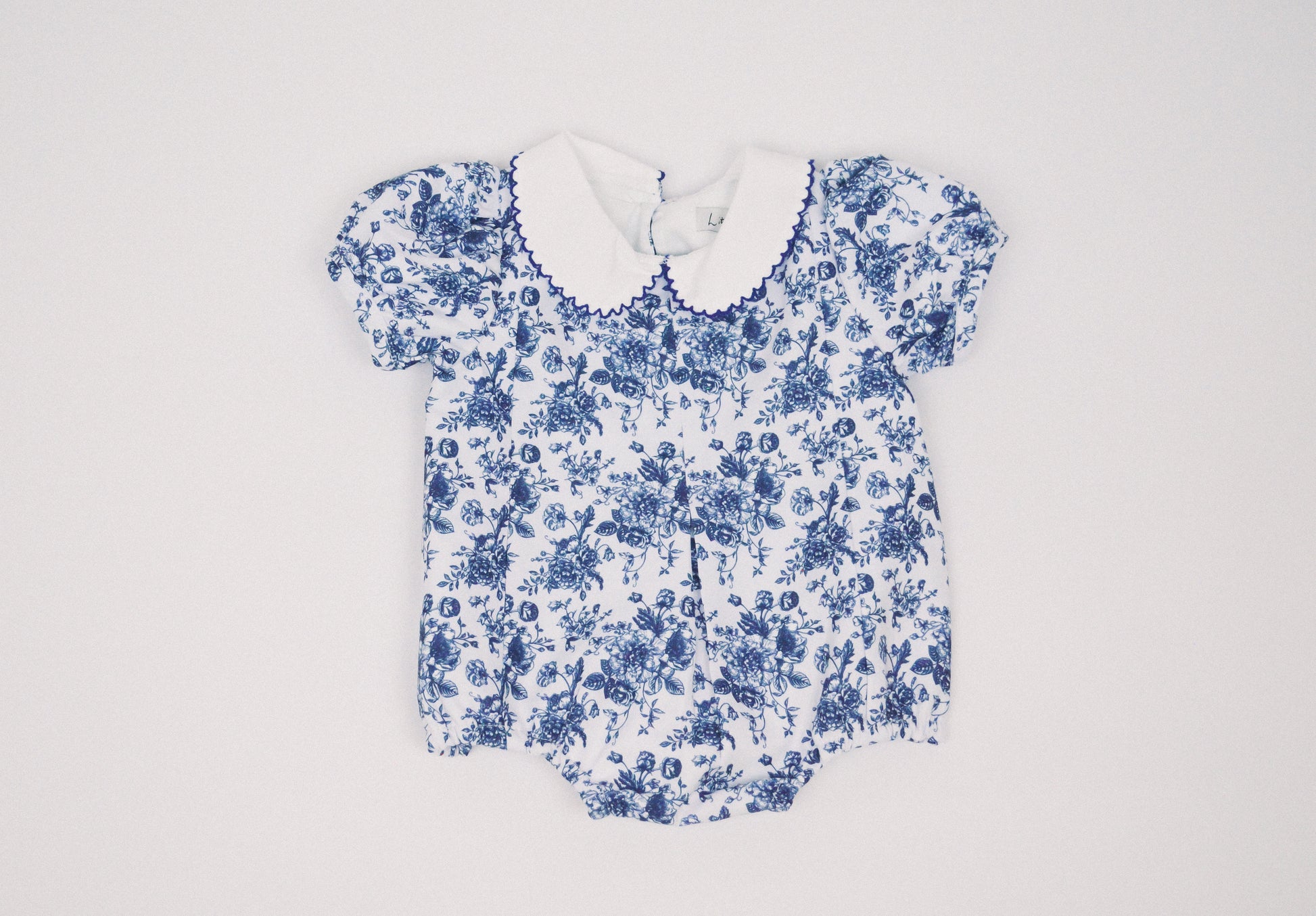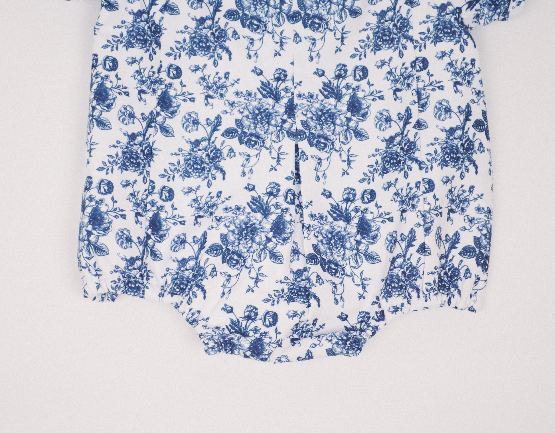 The Bailey Bubble is a charming and timeless piece, thoughtfully crafted from a soft, vintage-inspired blue toile cotton fabric.