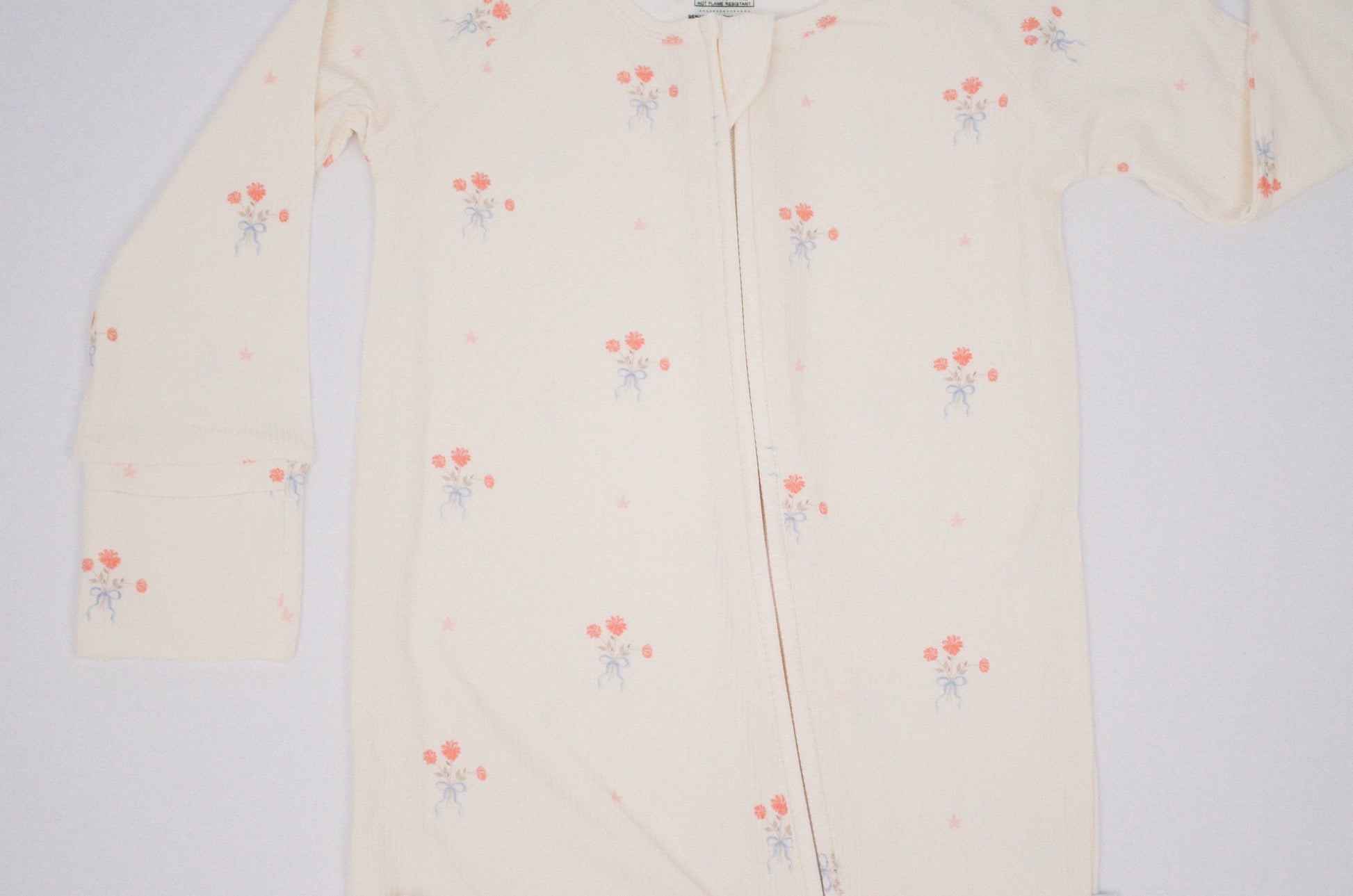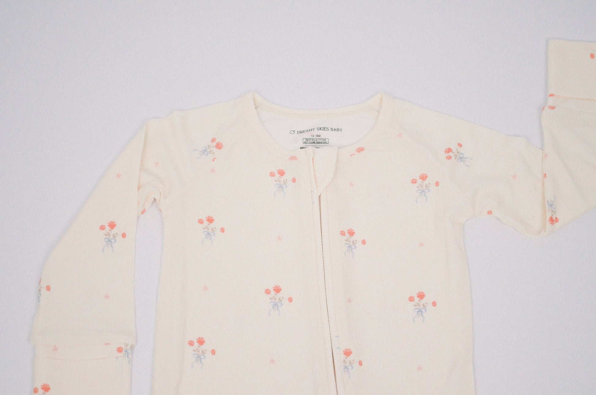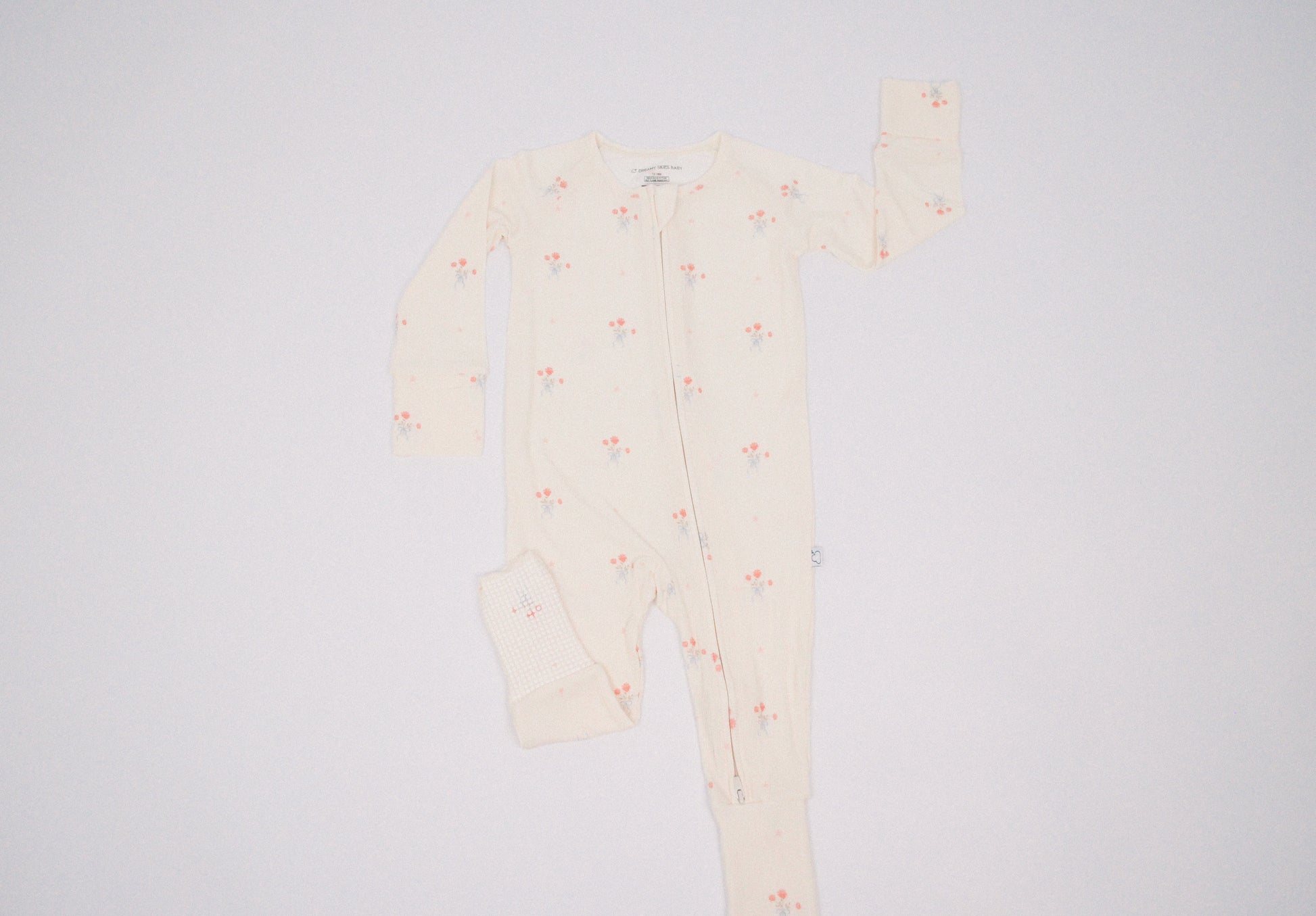 Soft ribbed bamboo fabric keeps baby comfortable with natural breathability. Features a two-way zipper for easy changes, fold-over mittens to prevent scratching, convertible feet for extended wear, and non-slip grips for safety.