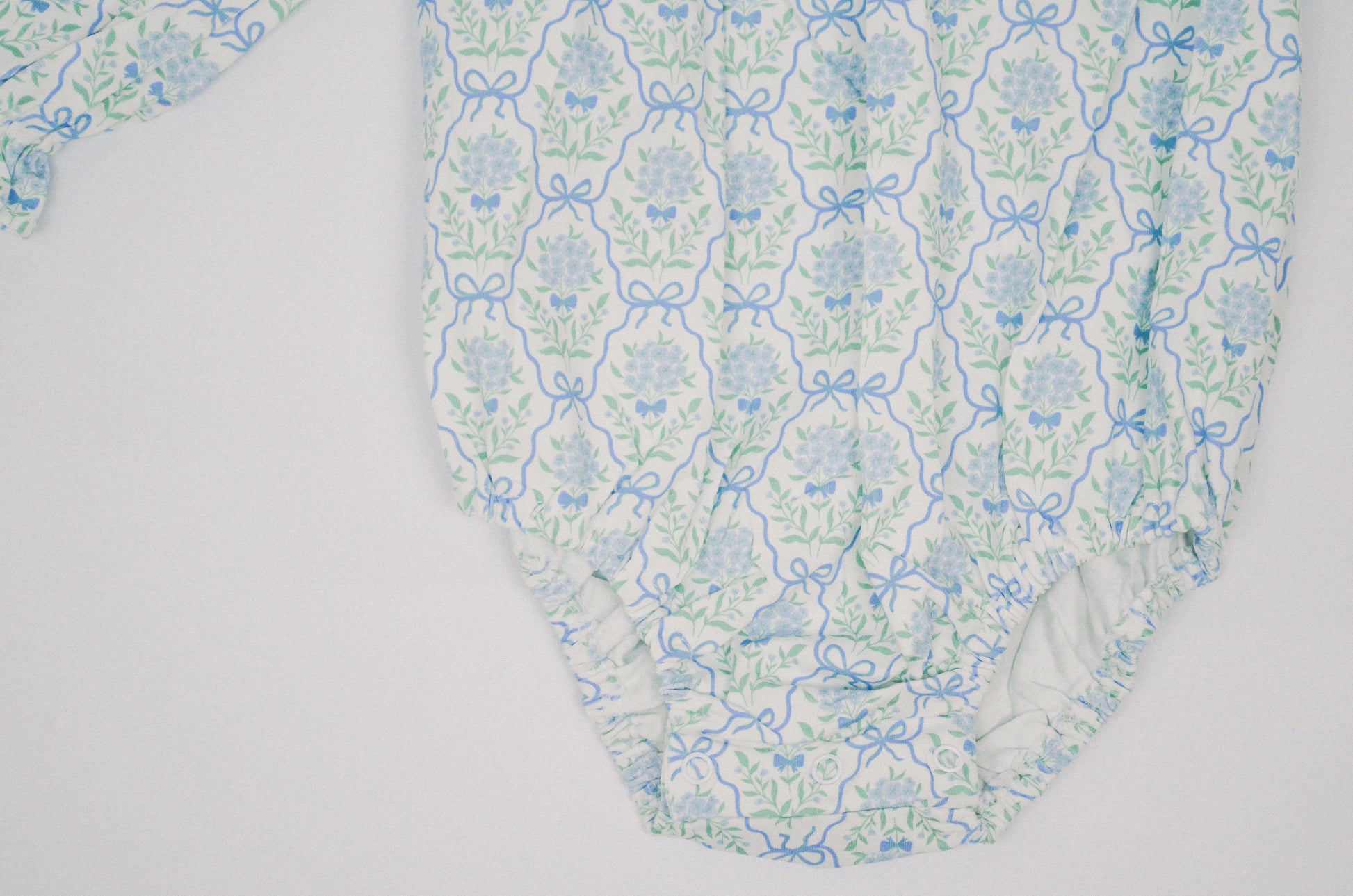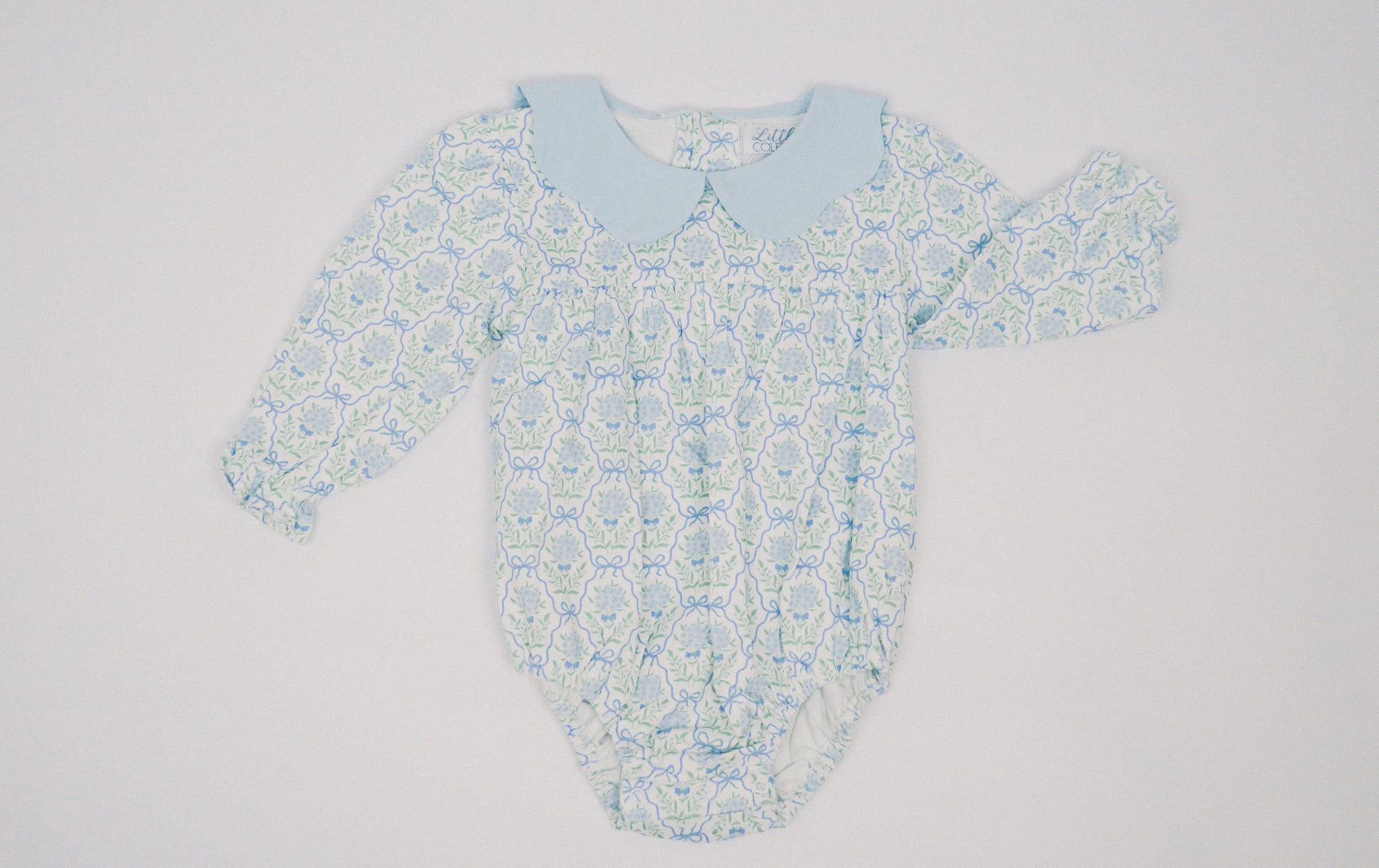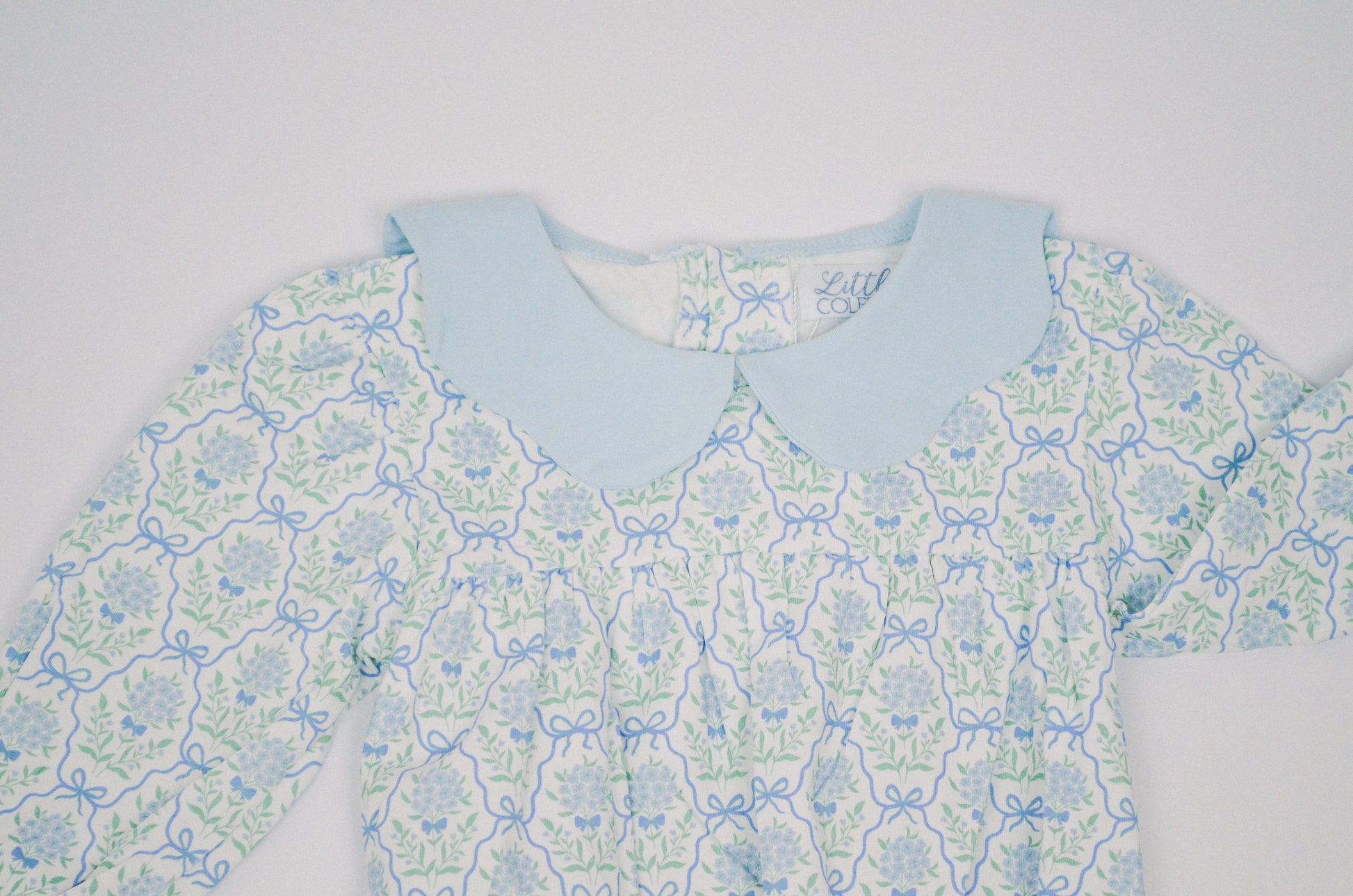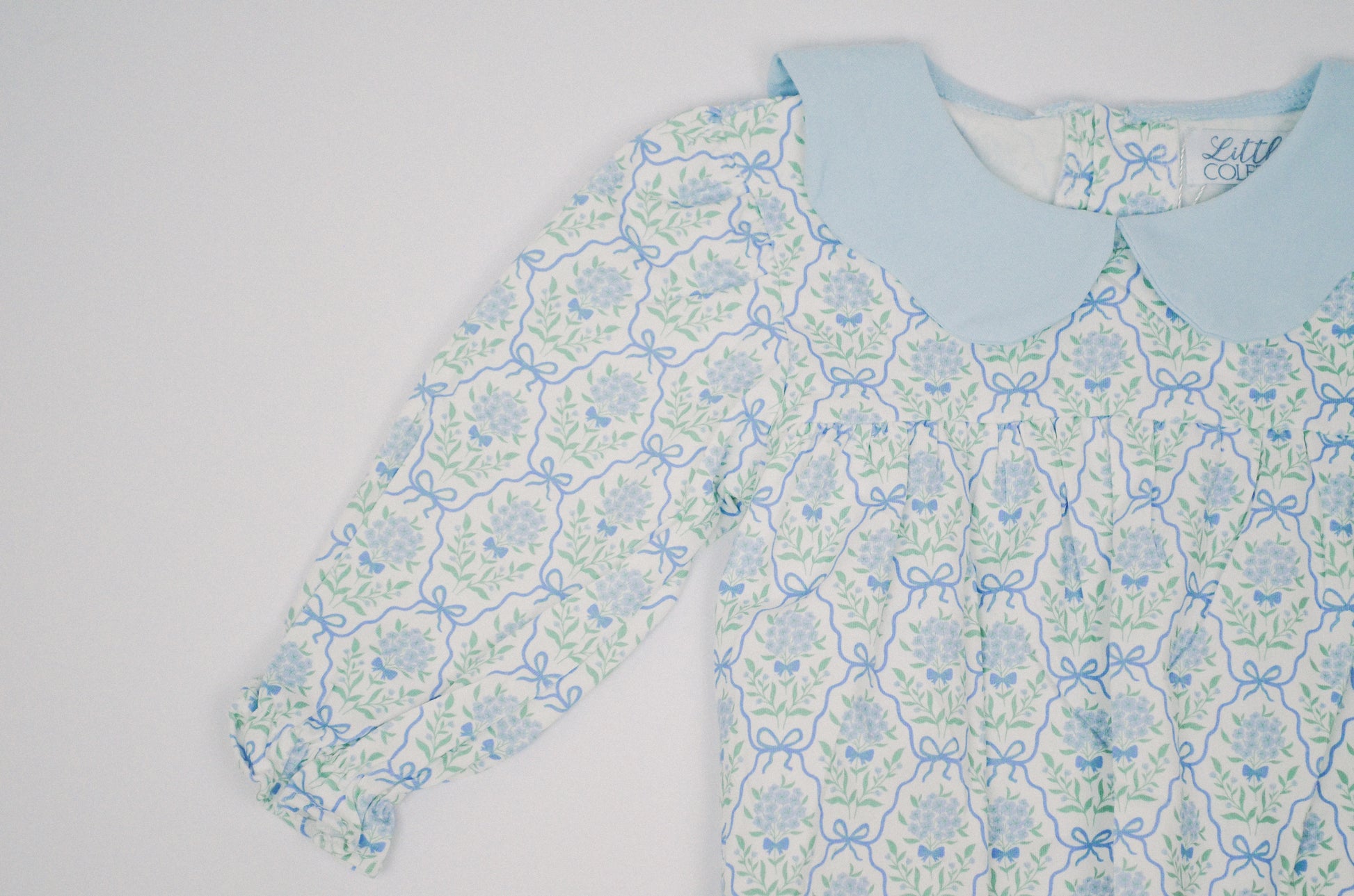 The Chloe Bubble is a stylish and versatile piece designed for comfort throughout the seasons. Crafted from a soft, breathable knit fabric, this dress ensures all-day comfort. This long sleeve dress showcases a charming blue and green floral print that brings a fresh, vibrant touch to your child's wardrobe.