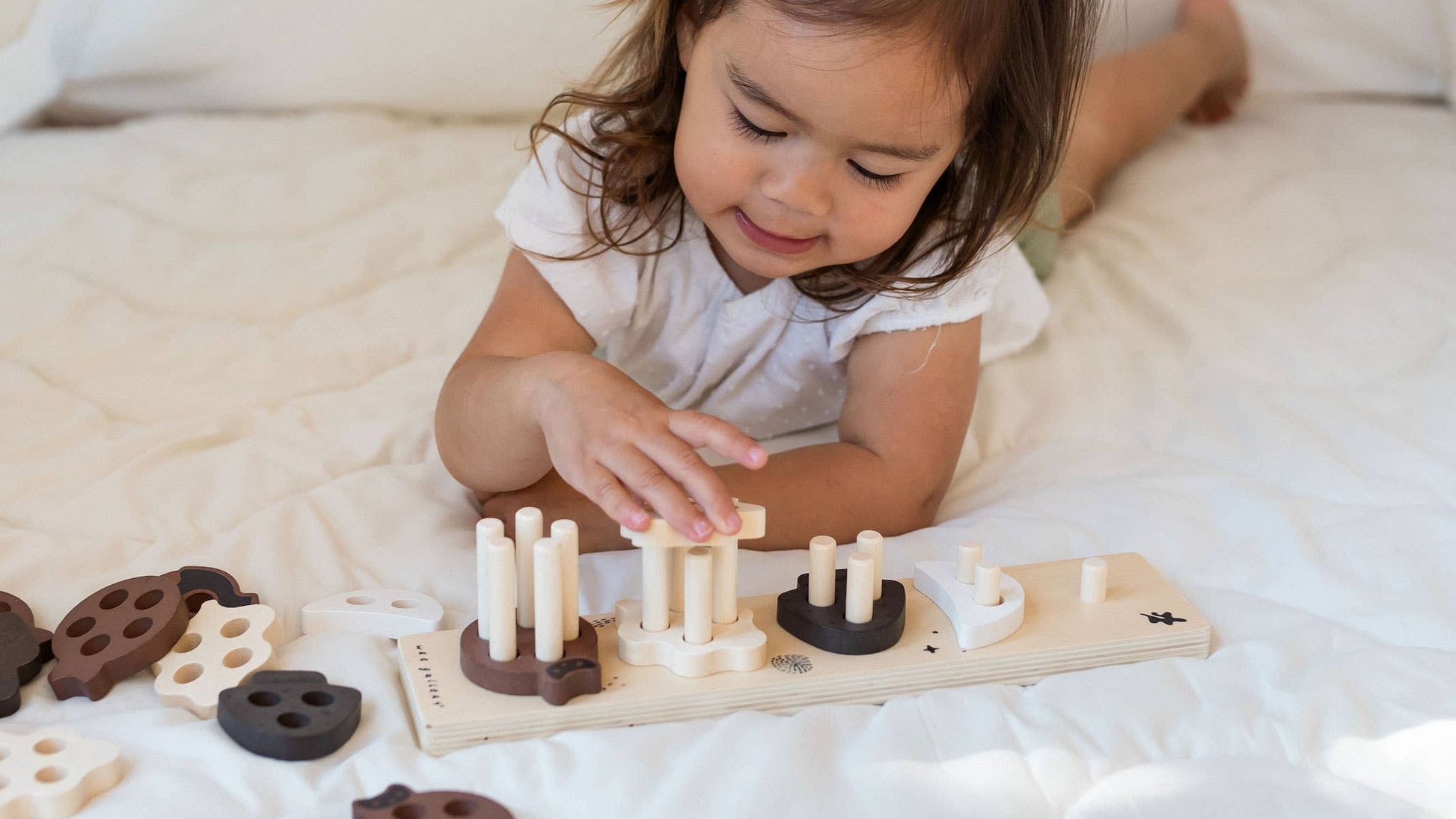 With the Count + Stack Toy, kids can sort, stack, and count the number of holes in the pieces to find the corresponding posts. Each shape has the same number of pieces as the number of holes and pegs — one acorn, two moons, three mushrooms, four leaves, and five ladybugs! Children can work on motor skills and spatial reasoning (a STEM, early math skill) while playing with this adorable woodland toy made of beautiful quality wood. A perfect gift for toddlers or preschool age children.