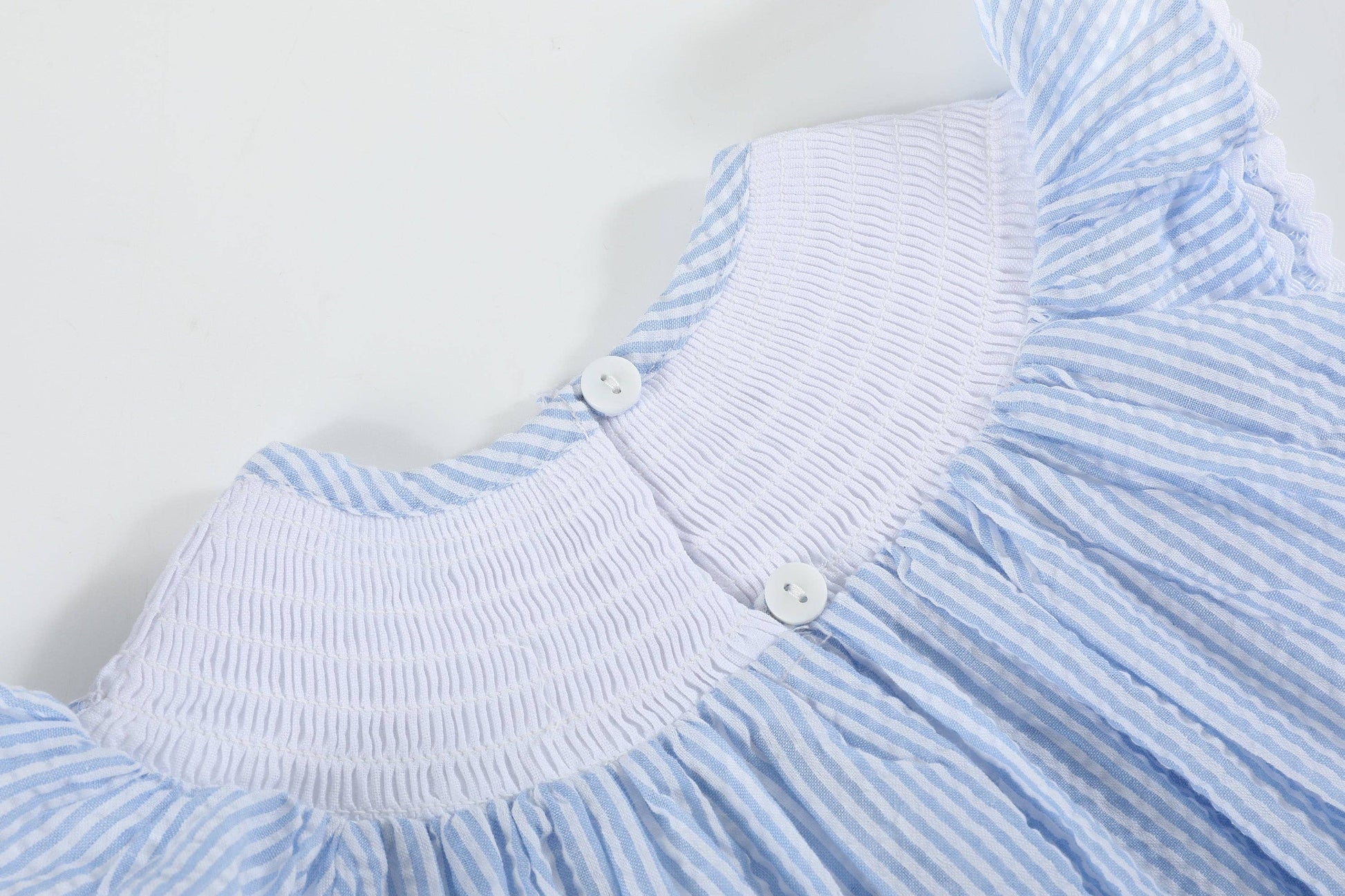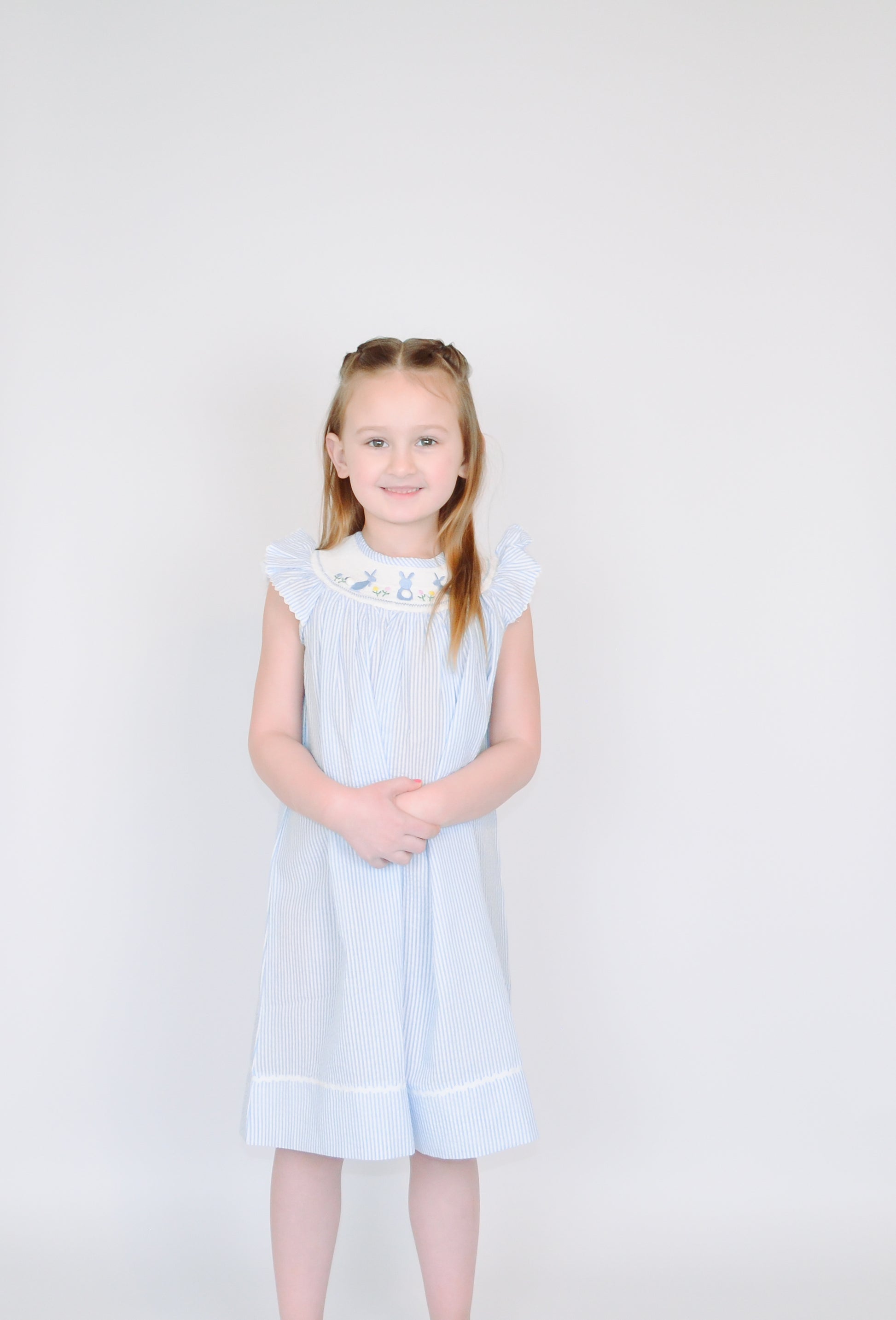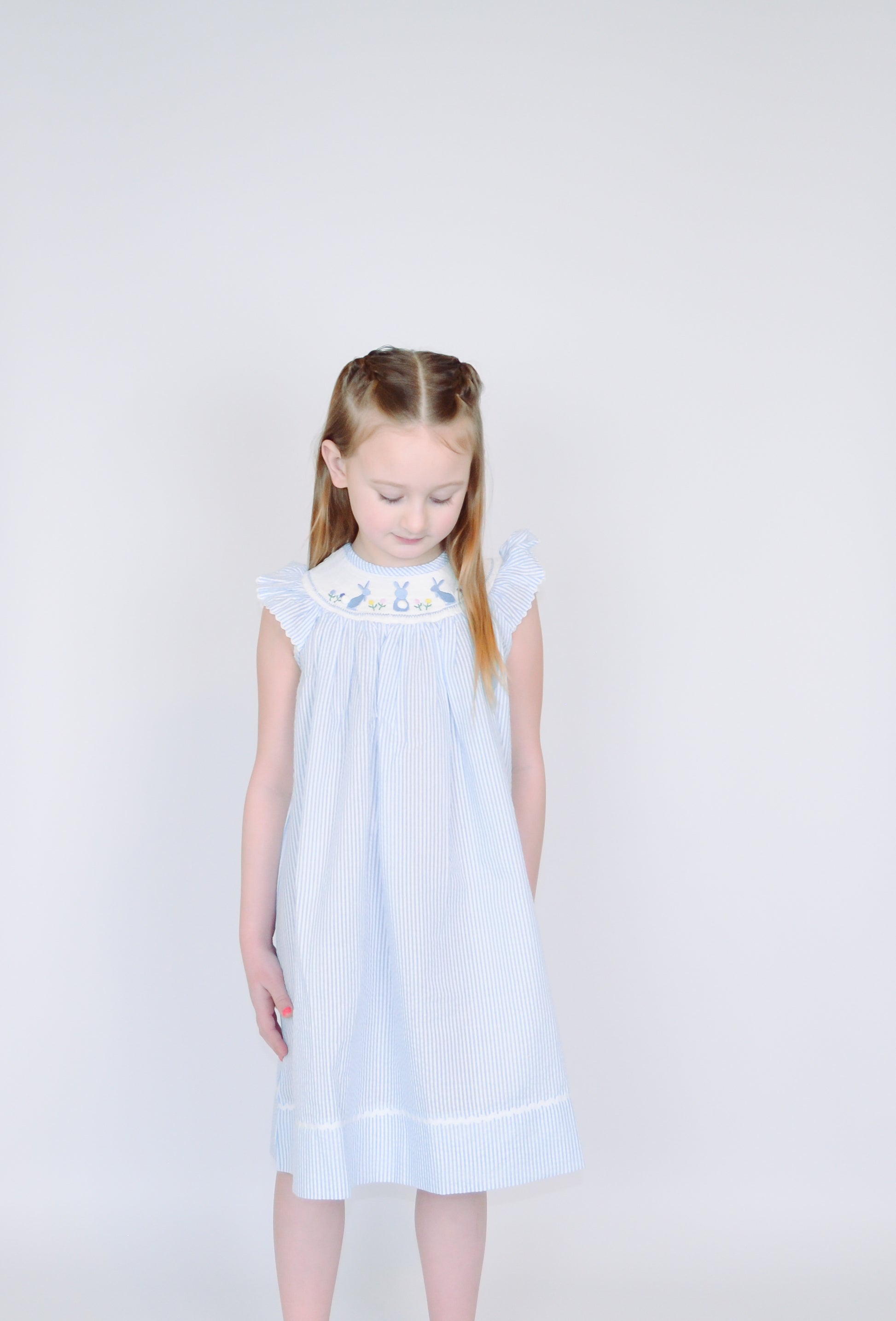 Crafted from enchanting light blue seersucker, it features a beautifully smocked neckline adorned with embroidered bunnies, each with an adorable pom-pom tail.