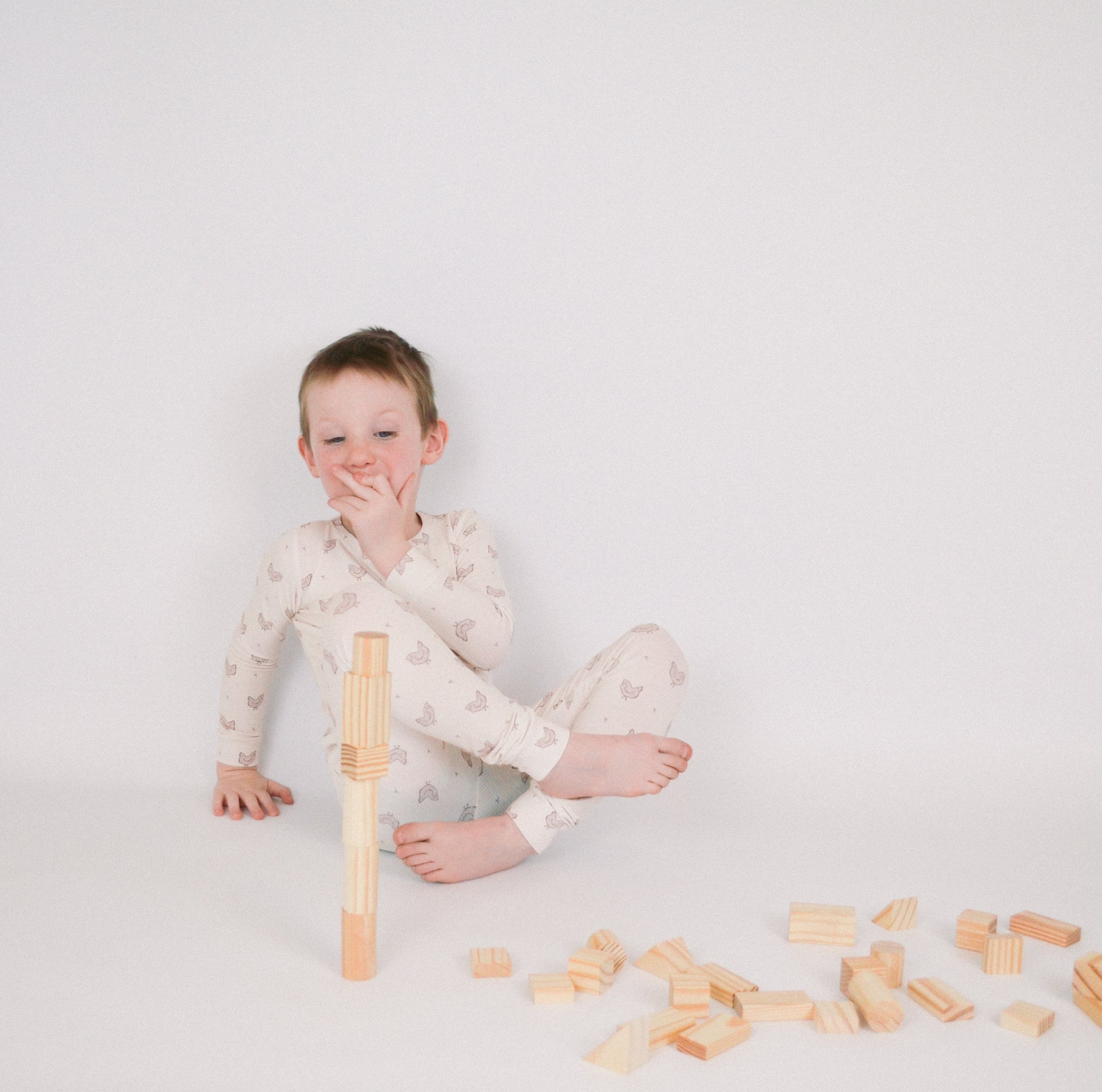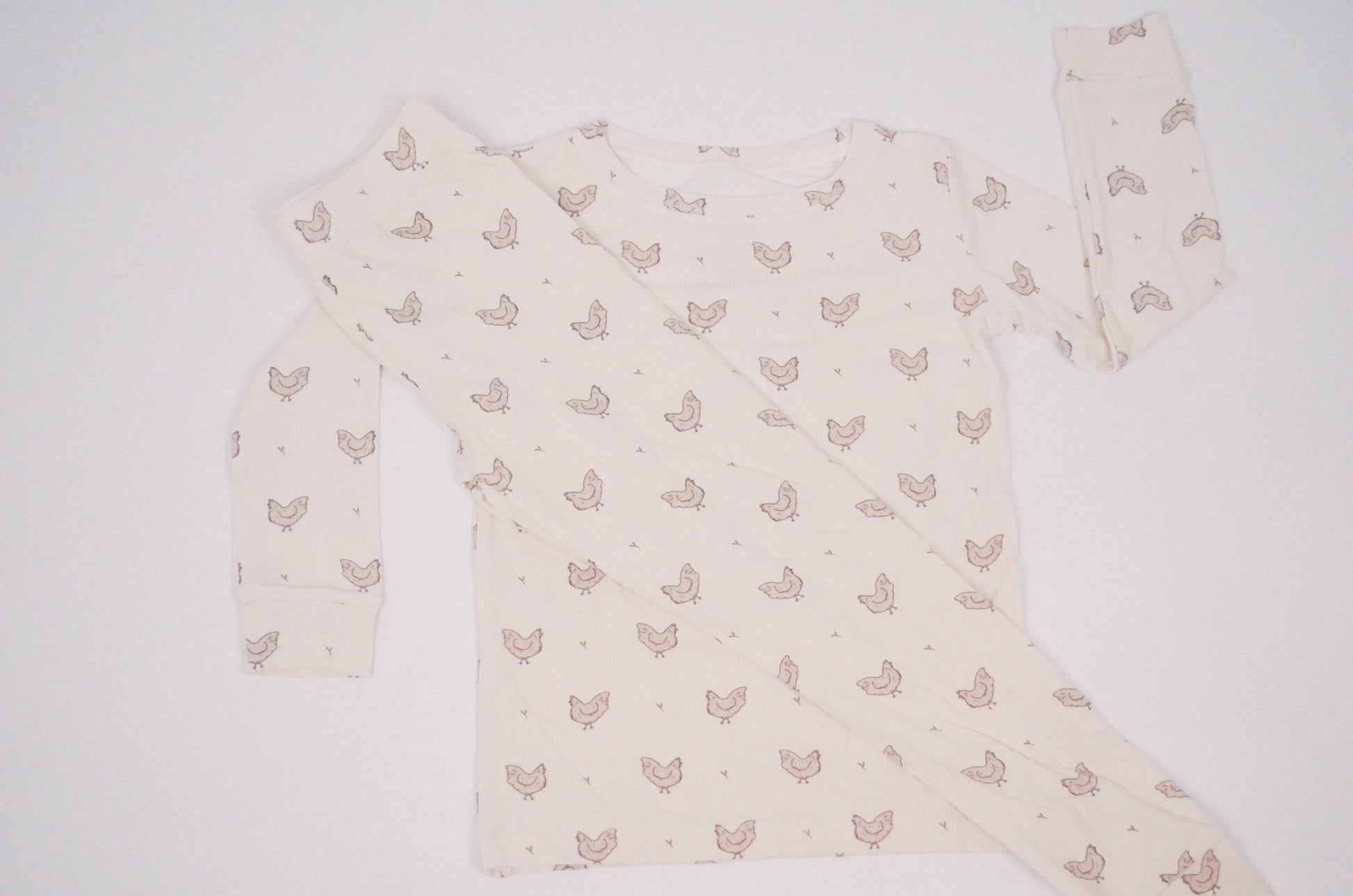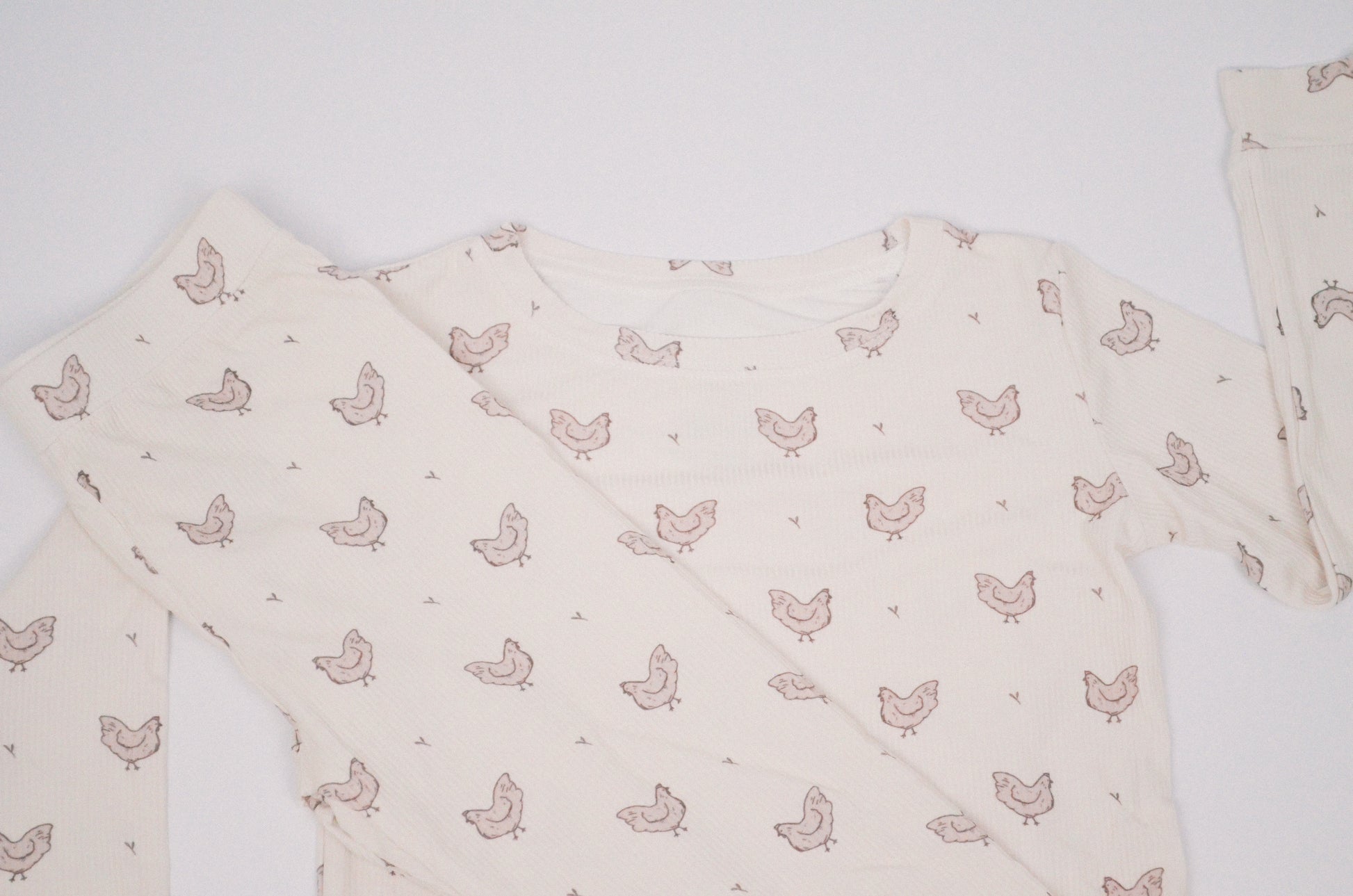 Crafted from premium bamboo fabric, this ribbed pajama set combines softness with durability for restful nights. The gentle ribbed texture provides a subtle stretch that moves with your child's body, while bamboo's natural breathability helps regulate temperature throughout the night. Featuring a charming chicken print that appeals to young sleepers, the set includes a coordinated top and bottom for complete comfort. Bamboo fabric is naturally hypoallergenic and gentle on sensitive skin, making it an excellent choice for children who need extra care.