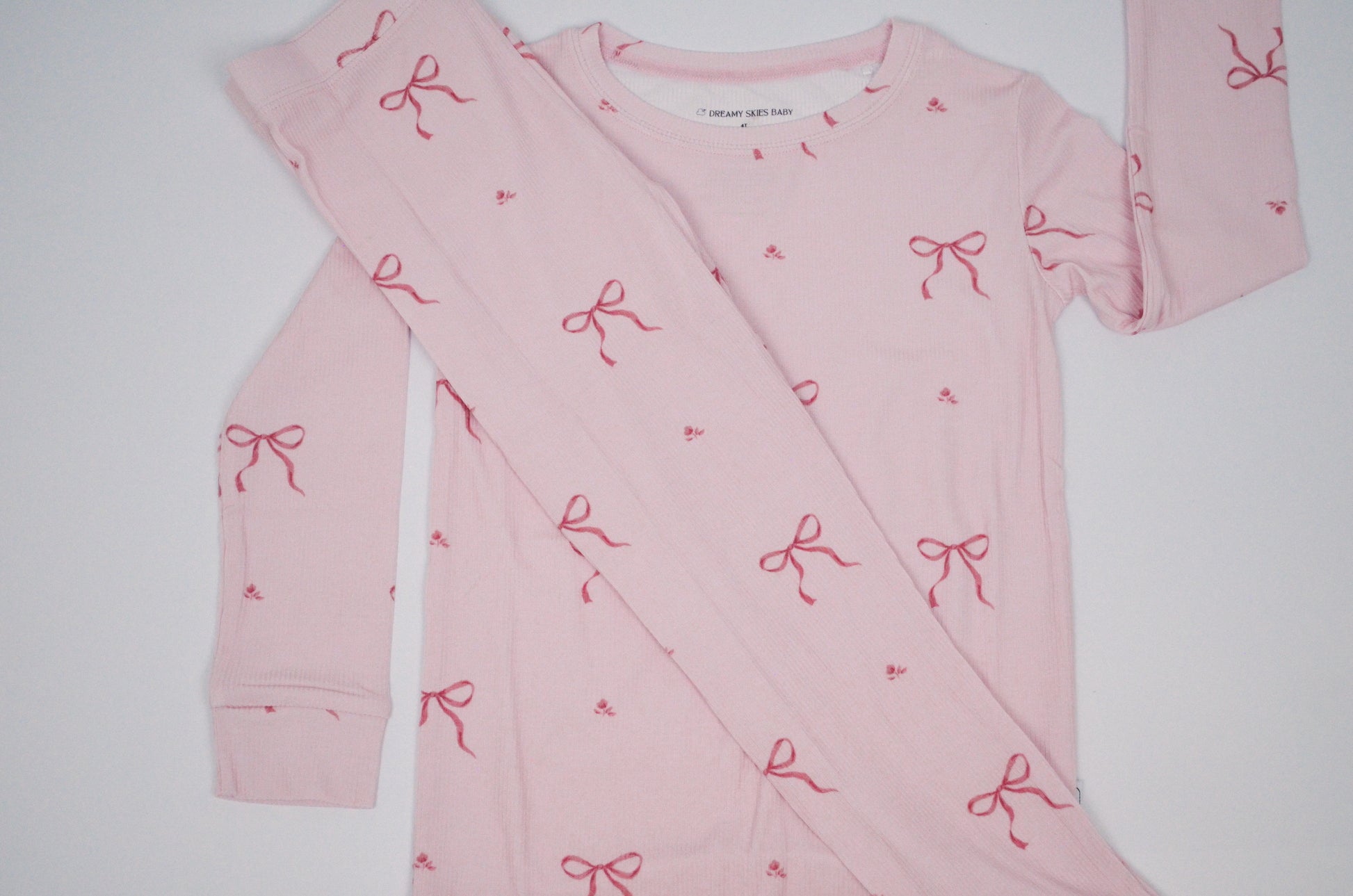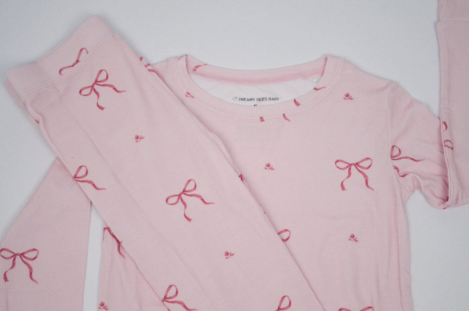 Crafted from premium bamboo fabric, this ribbed pajama set combines softness with breathability for restful sleep. The charming pink bow details add a playful touch that kids adore, while the gentle ribbed texture provides a comfortable, snug fit that moves with growing bodies. Bamboo's natural hypoallergenic properties make it ideal for sensitive skin, and the fabric naturally regulates temperature throughout the night. Perfect for bedtime routines or cozy lounging, this set delivers both style and comfort in one thoughtfully designed piece.