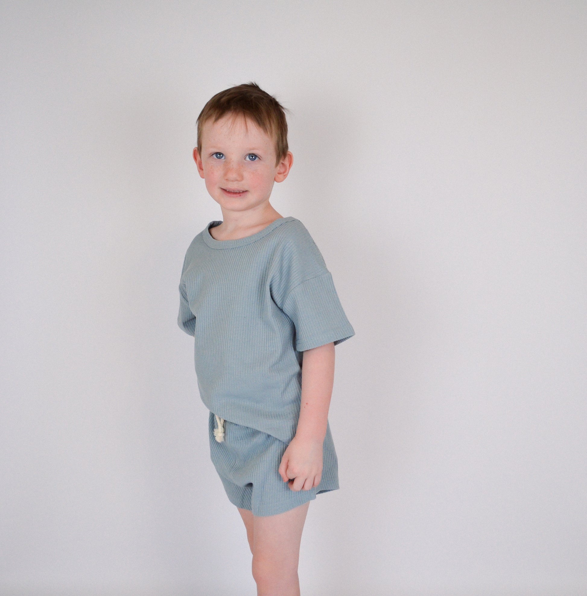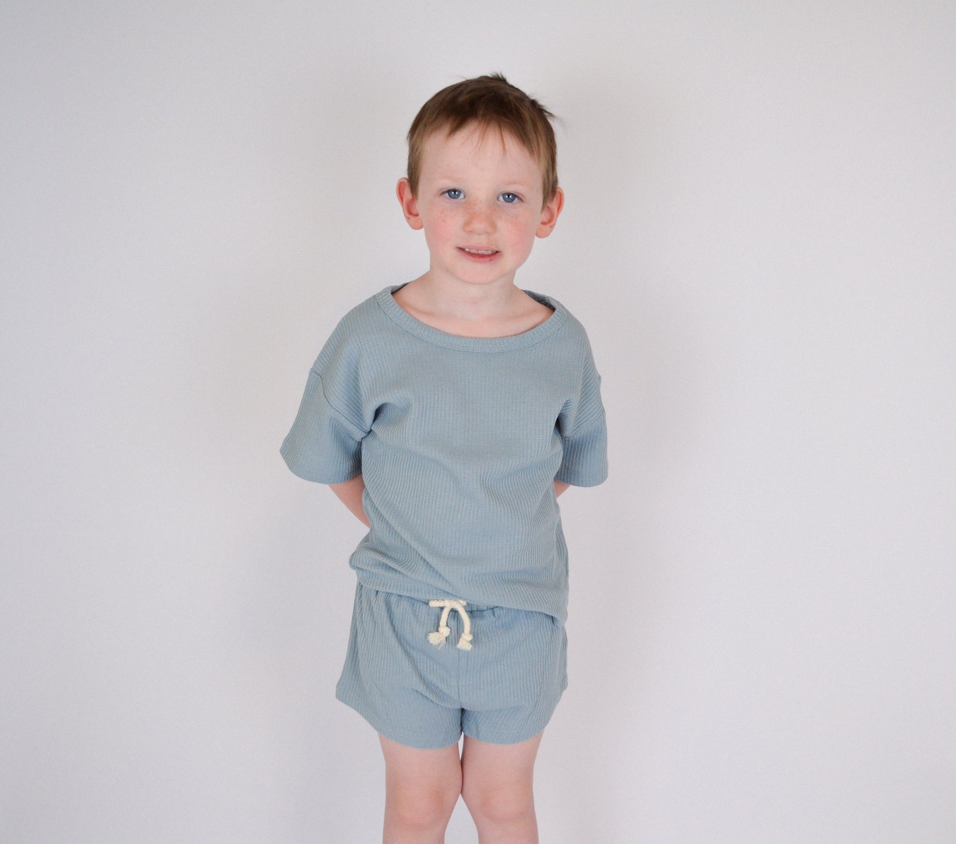 Crafted from premium waffle-knit fabric, this two-piece toddler set delivers both comfort and style. Features a functional and stylish drawstring. The soft blue hue adds a sophisticated touch to everyday wear, while the textured weave provides breathability for active play. Perfect for layering or wearing separately, this versatile set transitions seamlessly from casual days to special occasions. An essential addition to any toddler's closet.