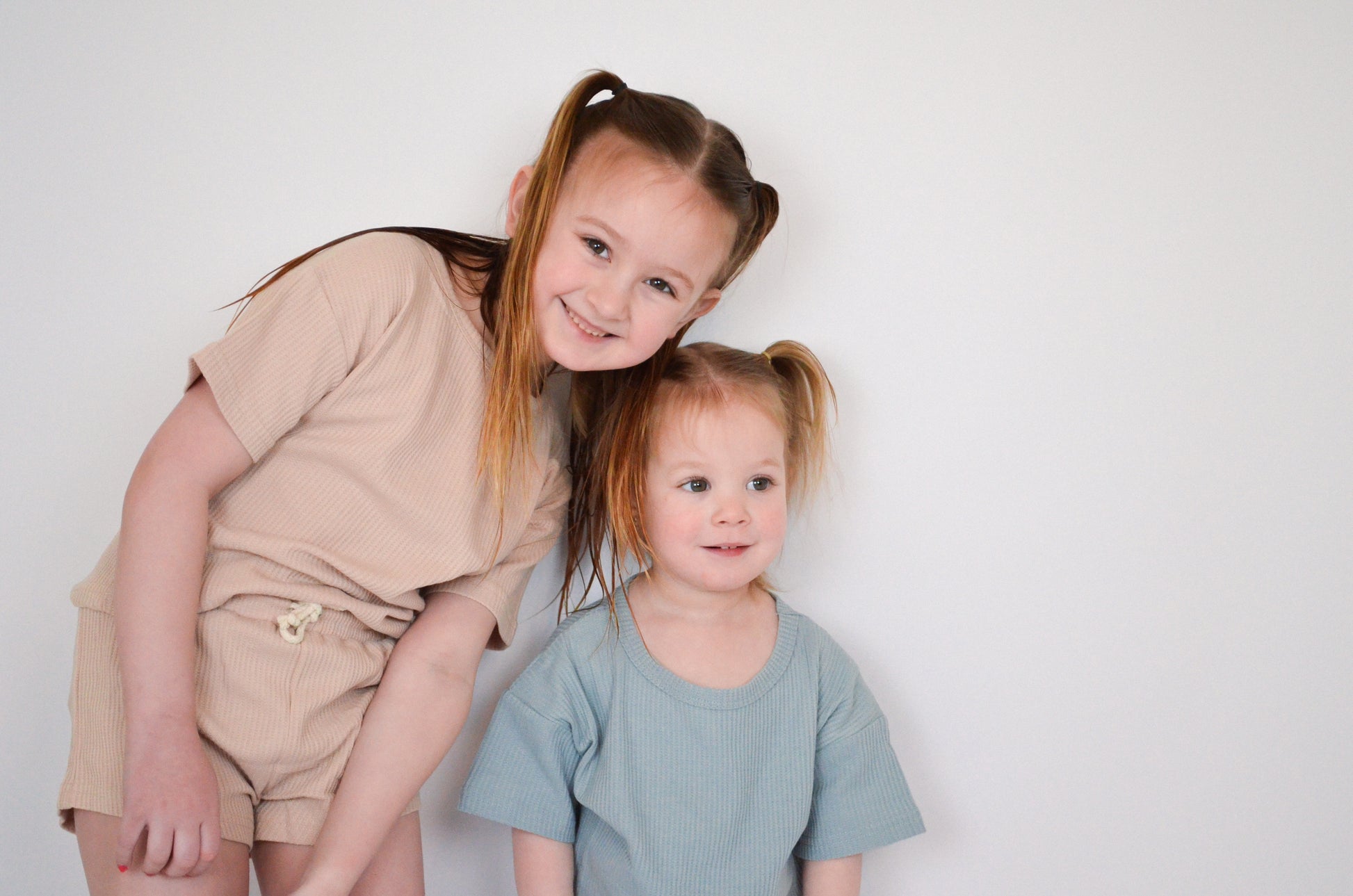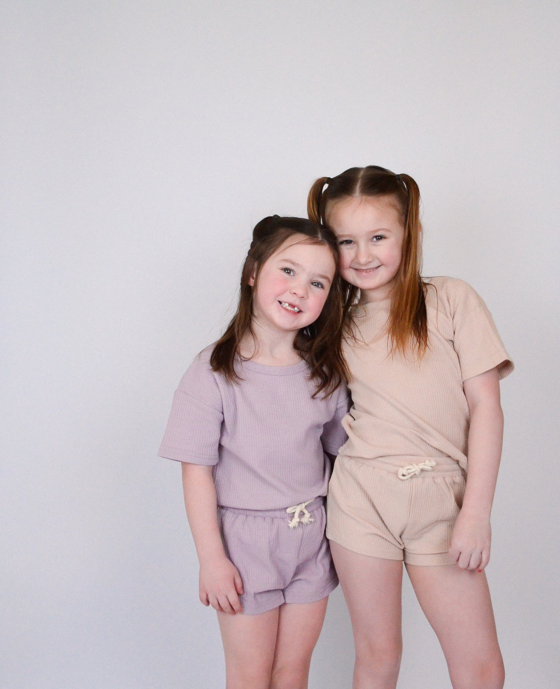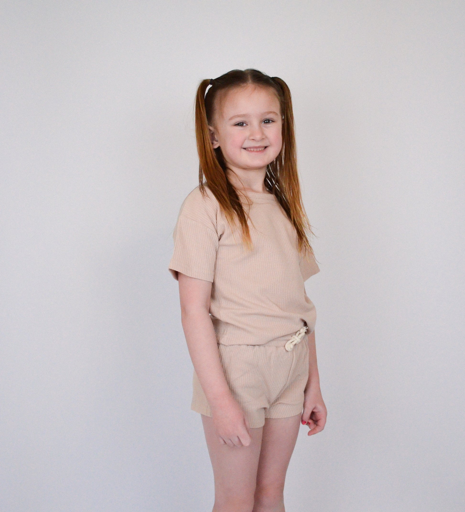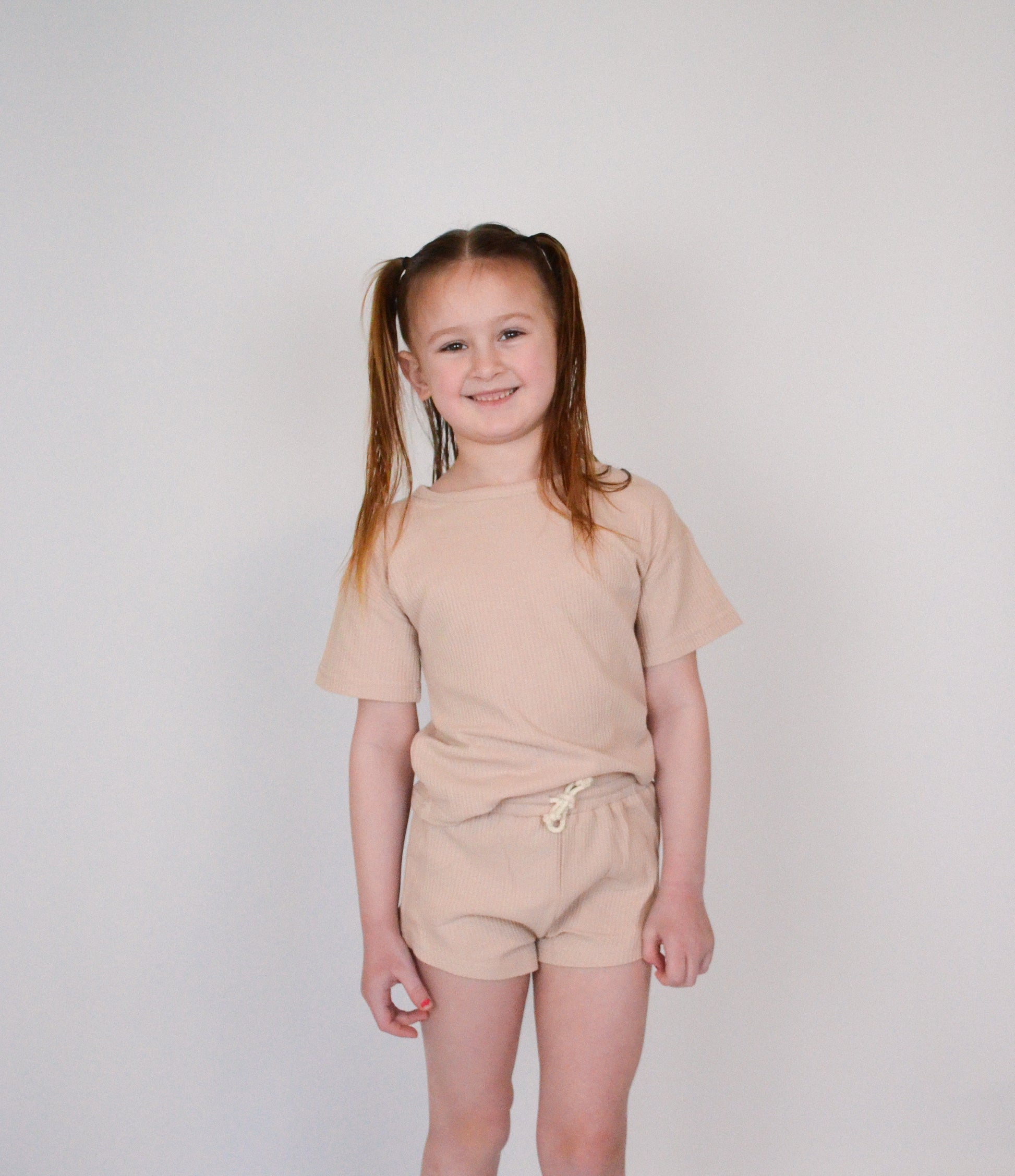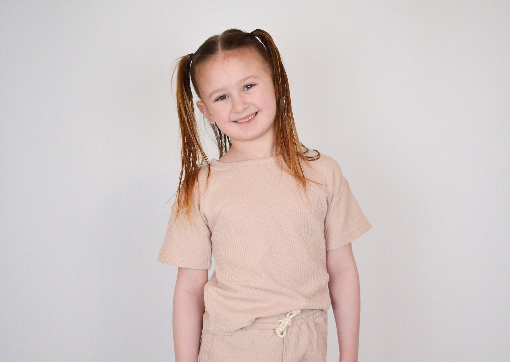 Crafted from premium waffle-knit fabric, this two-piece toddler set delivers both comfort and style. Features a functional and stylish drawstring. The soft tan tone pairs effortlessly with any wardrobe, while the textured weave provides breathability for active play. Perfect for layering or wearing separately, this versatile set transitions seamlessly from casual days to special occasions. An essential addition to any toddler's closet.